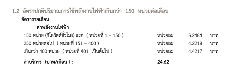 ประเภท 1.1 (ใช้ไม่เกิน 150 หน่วย/เดือน) เป็นอัตราก้าวหน้า ค่าไฟจะแพงขึ้นเมื่อใช้เกิน 150 หน่วย