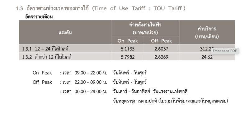 Off Peak จันทร์-ศุกร์ 22.00-09.00 น. และเสาร์-อาทิตย์, วันหยุดราชการ 00.00-24.00 น.อัตราประมาณ 2.63 บาท/หน่วย ตลอด 24 ชม.