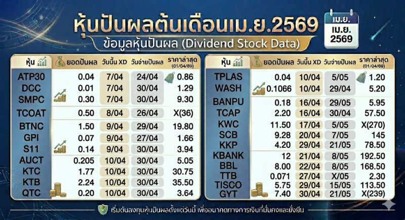 แปลงพอร์ต “เม่าสู่ VI” ลุยเก็บหุ้นปันผล รอบแรก เม.ย.69 เลือกมาให้แล้ว หุ้นที่จะขึ้น XD ต้นเดือนเมษายน จ่ายปันผลสวนกระแสลงทุน 0.01-12 บาท/หุ้น พร้อมแล้วไปกันเลย